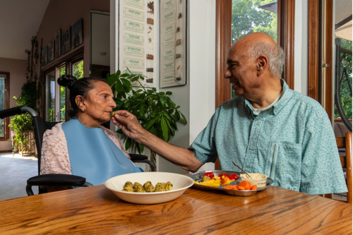 Kanu Mehta, 77, feeds his wife Sumi, 70, at their home in Michigan. Since her Alzheimer’s diagnosis in 2013, Sumi’s motor skills have progressively deteriorated. Now in the late stage of the disease, she requires full assistance with daily tasks like eating, showering, dressing, and mobility. (Photo by Alejandro Ugalde Sandoval)