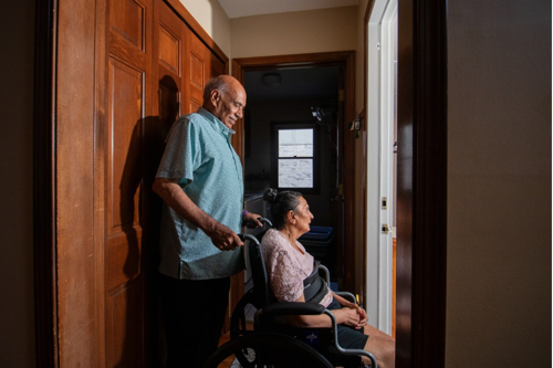 Mehta, 77, guides his wife Sumi’s wheelchair at their Michigan home. In 2013, at age 59, Sumi was diagnosed with early-onset Alzheimer’s disease, which has progressively impaired her physical and mental capabilities.
