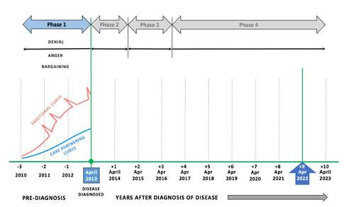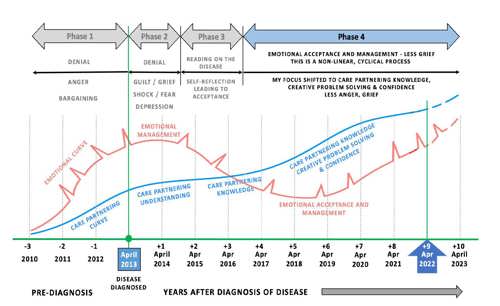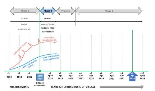 To dive deeper into the relationship between the intensity of emotions I felt and the amount of time I spent as a Care Partner, learning as I went, it’s worth looking at a chart of our Journey showing the phases Sumi went through over time.