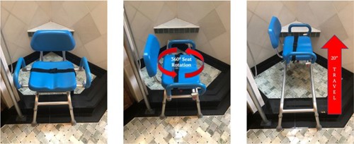 As shown below in photo A, we make Sumi sit in the chair outside of the shower stall and fasten a lap belt. Then, shown in photo B, we use the swivel mechanism to rotate the seat 90˚ anti-clockwise. After that, we slide the seat with Sumi on it into the shower stall, photo C. The seat can slide up to 20 inches. After showering, the process is reversed and Sumi gets up from the chair outside the shower stall.