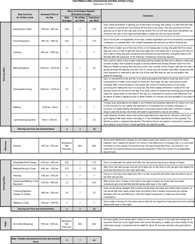 Out of 24 hours in a day, nine hours are considered as instrumental activities requiring assistance. These activities are a general guideline as no two days are exactly the same for Sumi and the activities may happen at slightly different times.