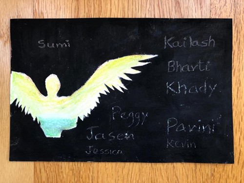 My Art for Caregivers classes have resumed. A week ago, we painted an angle. The instructor asked us to write the names of angles in our lives. There are so many angles in our lives that it was difficult to write them all. Sumi is the main angle who is teaching me a lot. For others, I used the criteria of the ones who have stayed in our house or who are Sumi’s care givers.