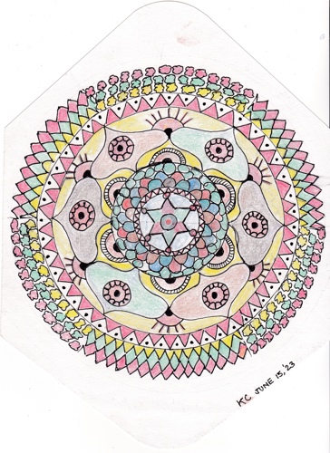 In the class, we started with two concentric inner circles of different sizes and expanded them outward to whatever came to our mind while doing it. There was no pre-planned design – it just evolved. I spent one hour in the class and about two hours at home last night to finish it. I found it relaxing and meditative. Afterward, had no trouble falling asleep!