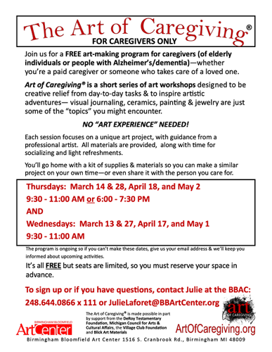 In 2020, due to Covid, these classes were suspended. Starting April 2020, they are resumed virtually. These classes are free for caregivers and no previous art experience is needed.